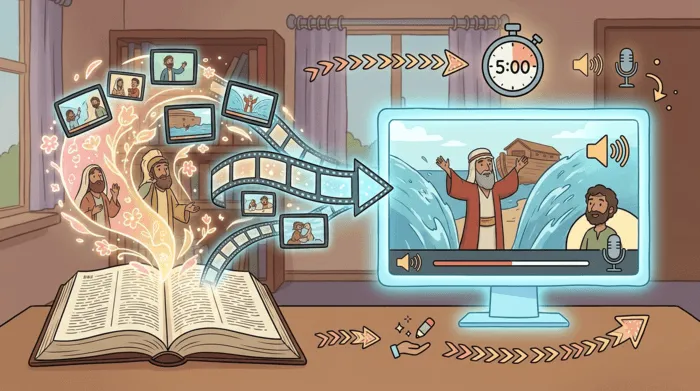 Directly turn bible stories or scripture into 5-minute animated videos with sound and narration.