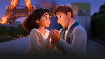 Atmosphere & Decor: Gold and red heart-shaped glitter and confetti are floating in the air around her, creating a magical, Valentine's-inspired scene.